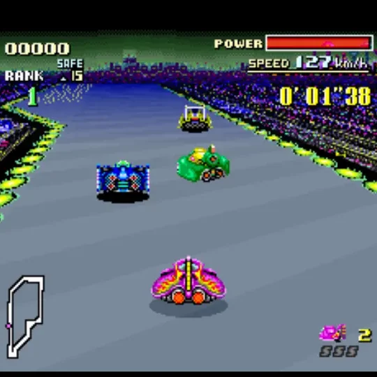 The soundtrack is legendary: high‑energy anthems such as Mute City and Big Blue pump adrenaline straight through the controller. Engine hums, boost whooshes, and damage alarms all add tension without overwhelming the mix. Even today, the soundtrack is one of the system’s finest, capturing the raw momentum of futuristic racing.